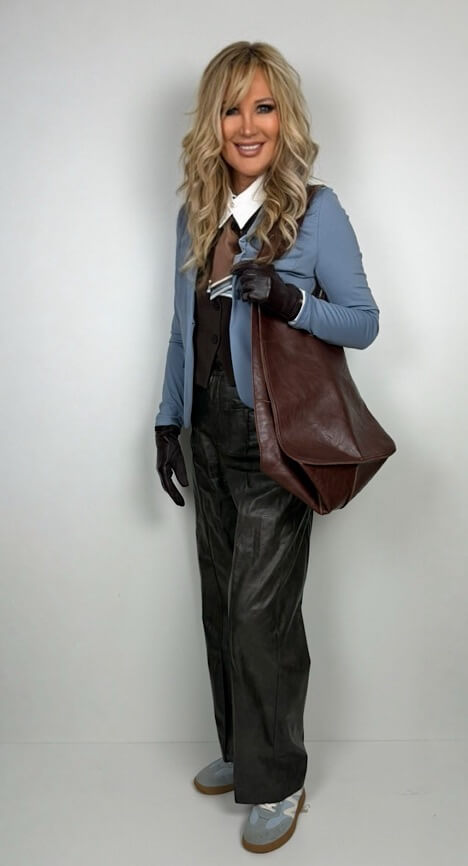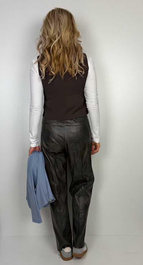 Kurze Anzugsweste in Schokobraun mit seitlichen Pattentaschen und vier Knöpfen ton in ton zu schließen.