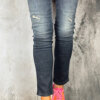 Mittelhoch geschnittene, sehr elastische Jeans im Farbton Screene Blue, von Elias Rumelis, in destroyed und Vintage-Optik, mit Reißverschluss und schmalem Schnitt. Fällt normal aus. Sandra ( normal Gr. 36) trägt hier 26.