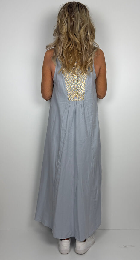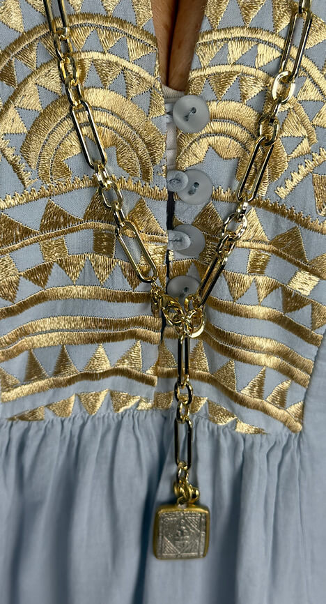 Wunderschönes Kleid von Greek Archaic Kori, im Farbton Light Grey/Gold, aus doppellagiger, hauchzarter, weicher Baumwolle.