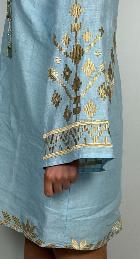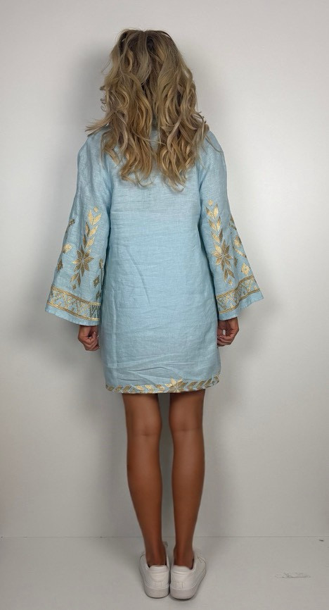 Wunderschönes, kurzes Kaftankleid von Greek Archaic Kori, im Farbton Ciel/Gold, mit aufwendiger Bestickung.
