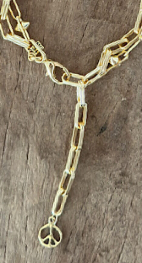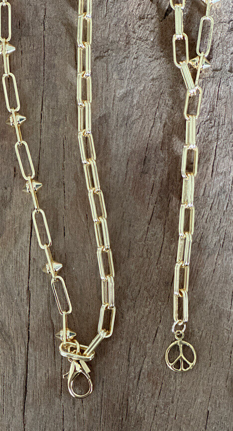 Großgliedrige Halskette PEACE double von ICON, im Farbton Gold, mit kleinem Peace-Anhänger und Karabinerverschluß.