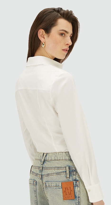 Die JOSH V Gael Damenbluse in der Farbe Off White ist ein Blusenbody. Die Bluse ist aus einem komfortablen, elastischen Popeline-Stoff mit Bio-Baumwolle gefertigt. Sie hat eine körpernahe Passform und wird unten mit Druckknöpfen geschlossen. Die Knöpfe auf der Vorderseite sind mit dem JOSH V Logo veredelt, was der Bluse eine besondere Ausstrahlung verleiht. Egal ob Business-Dinner oder Shopping-Tag – diese weiße Bluse ist perfekt für verschiedenste Anlässe.