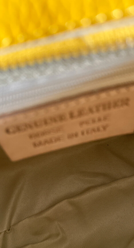 Echtledertasche im Farbton Gelb, längenverstellbarem Träger, mit Reißverschluss zu schließen und mit einer kleinen Reißverschluss-Innentasche.