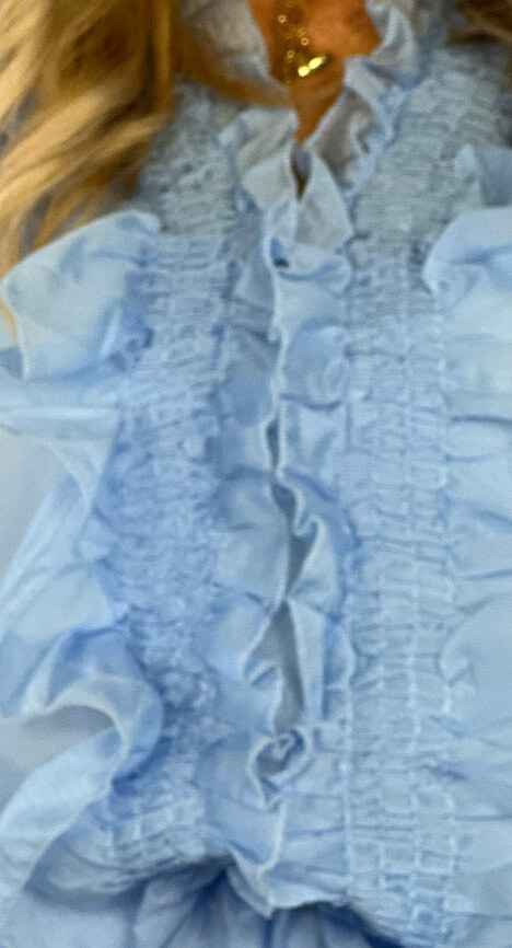 Zuckersüße, leicht transparente Bluse Myrtia von Noella, im Farbton Air Blue, mit V-Ausschnitt, gesmokten Rüschen entlang der Front.