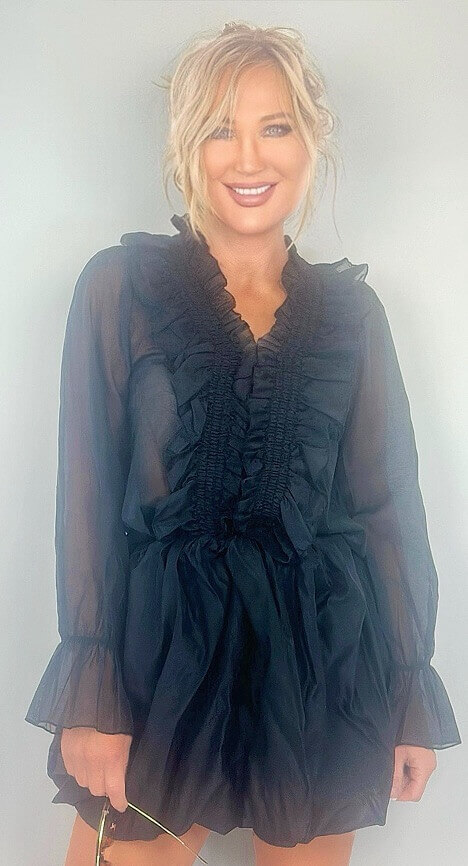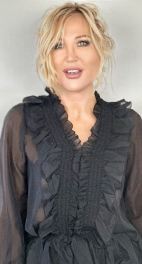 Zuckersüße, leicht transparente Bluse Myrtia von Noella, im Farbton Black, mit V-Ausschnitt, gesmokten Rüschen entlang der Front.