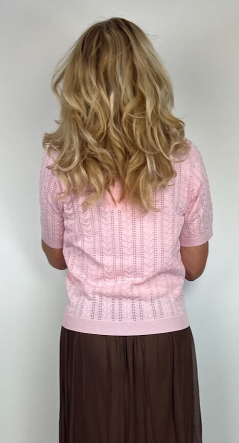 Zauberhaftes Viskoseshirt von Noella, im Polostyle, im Farbton Baby Pink (einem warmen Roseton), mit feinem, zartem Lochmuster. Kurze Knopfleiste.