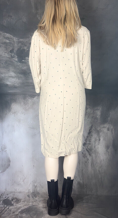 Elastisches Kleid von Penn & Ink, im Farbton Beige, mit kleinem Kragen und kurzer Knopfleiste, 3/4 Arm und einem Druck allover ABC im Farbton Schwarz.