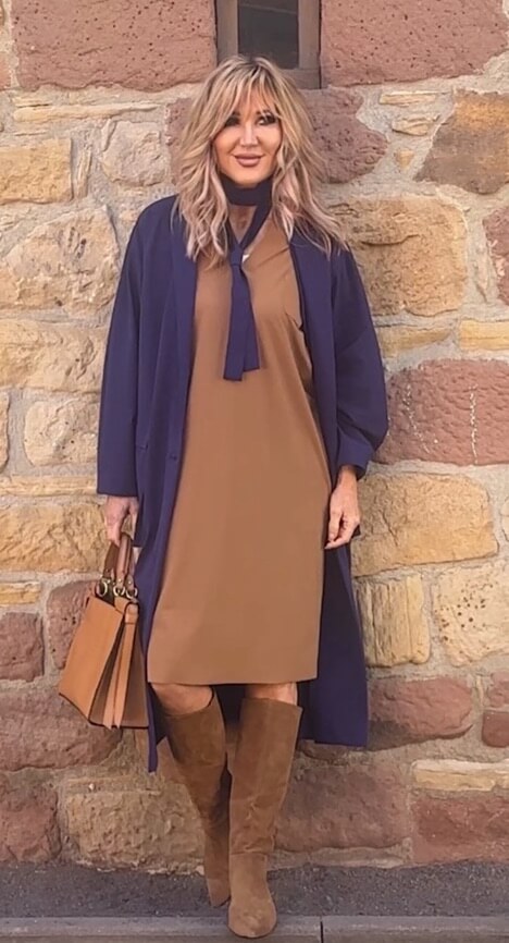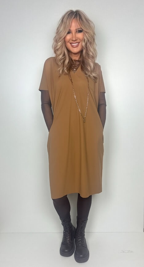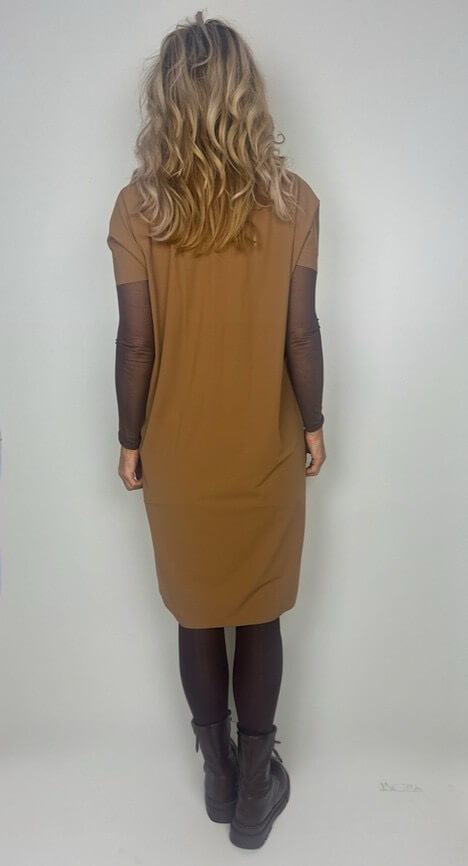 Lässig geschnittenes Kleid von Penn & Ink, im Farbton Tanine, einem warmen Camelton, in Kofferqualität, 2 seitlichen Eingrifftaschen und V-förmiger Halslösung.