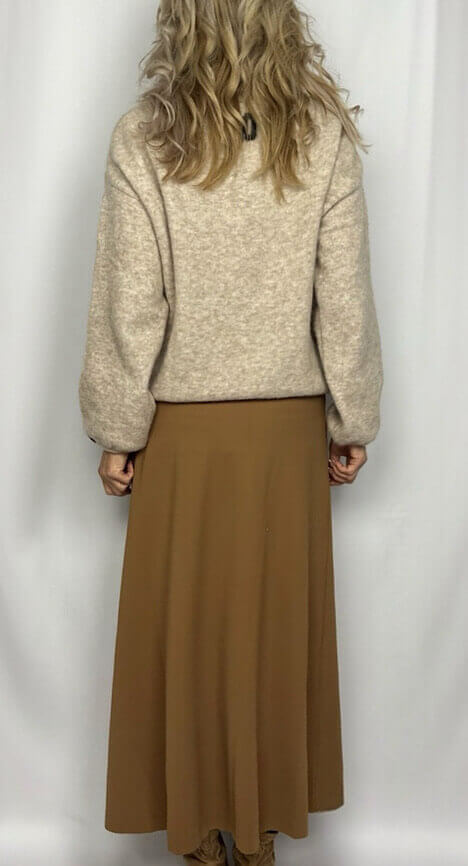 A-förmig geschnittener Rock von Penn & Ink, im Farbton Tanine, einem warmen Camelfarbton, in bügelfreier Kofferqualität mit flexiblem Bund.