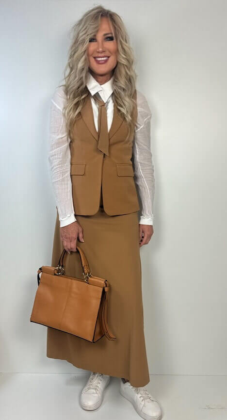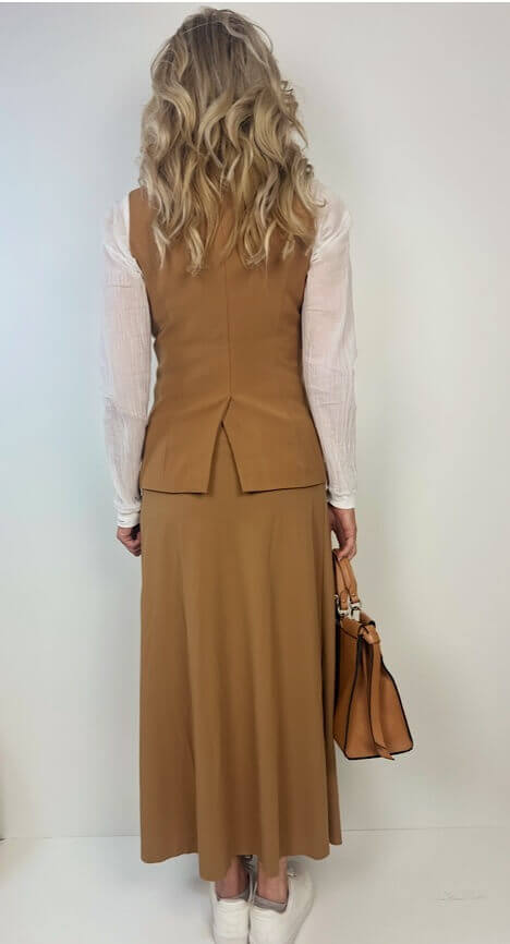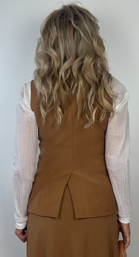 Anzugsweste im Farbton Tanine, mit einem Knopf zu schließen. Aufwändig, Hinten geschlitzt und mit Eingriffstaschen vorne.