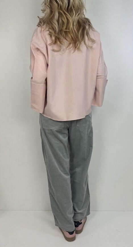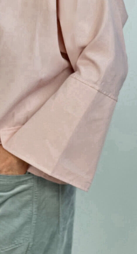 Kastig geschnittene Bluse, im Farbton Rose, mit durchgehender Knopfleiste, kleinem Kragen und weiten Ärmeln, wahlweise genöpft oder offen zu tragen.