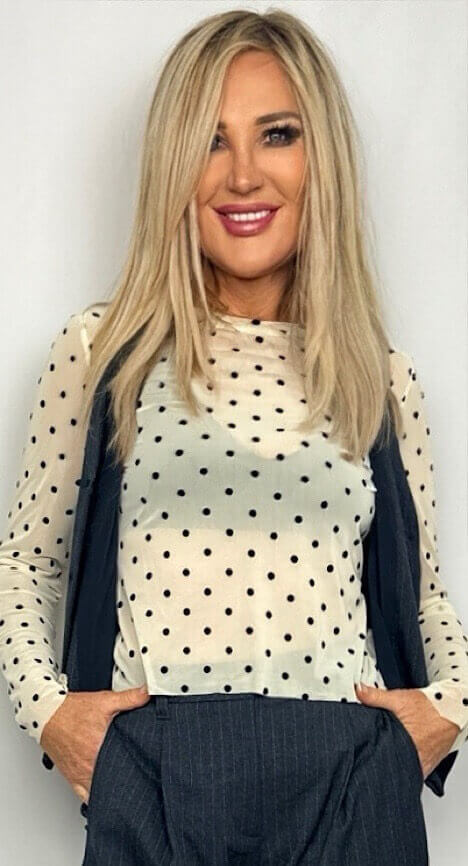 Transparentes Longsleeve, im Grundton Offwhite, mit schwarzen, kleinen Punkten.