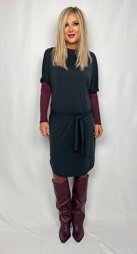 Körpernah, schwer fließendes Kleid von Zhrill aus Modal, knitterarm und angenehm weich, im Farbton Schwarz, mit Rundhalsausschnitt, Halbarm und mit einem seitlich angenähtem Bindeband aus gleichem Stoff, vorne und hinten zu binden, wobei man sehr gut vorne kaschieren kann (nach vorne kreuzen) oder hinten, (zunächst nach hinten kreuzen) – der jeweilige Teil liegt dann kaschierend in Falten. Saum rund in einen kleinen Schlitz seitlich gehend.
