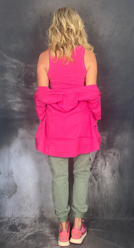 Rippshirt von Zhrill, mit kleinem Rundhalsausschnitt im Farbton Pink, mit offenen Kanten.