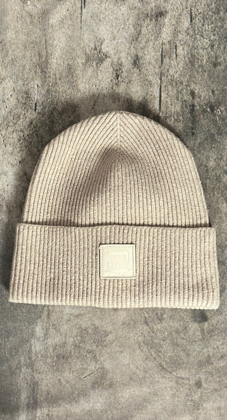 Kuschelige Mütze ZHRADJA von Zhrill im Farbton Taupe, mit einem großen Zhrill-Patch Ton in Ton und großem Aufschlag.